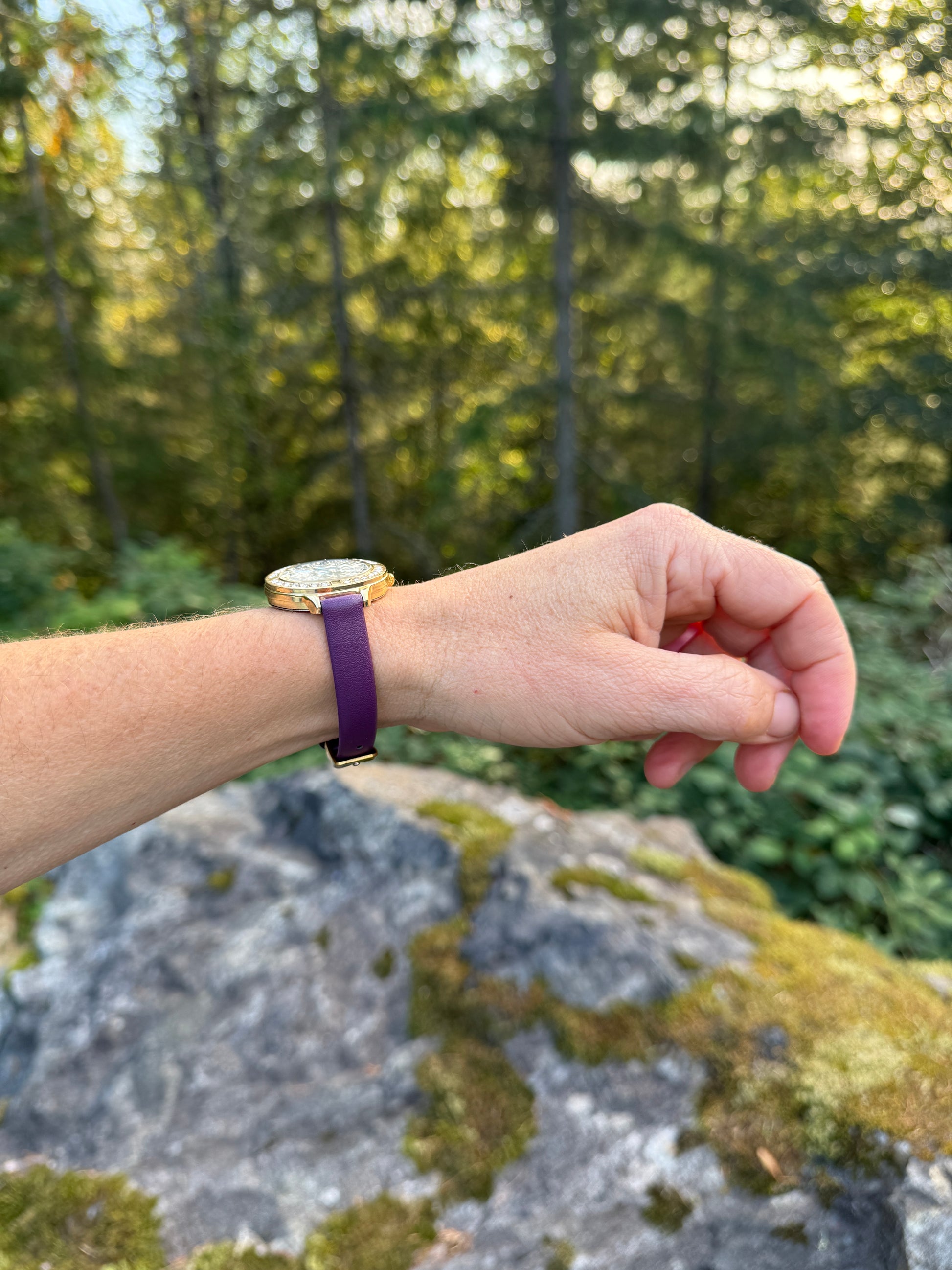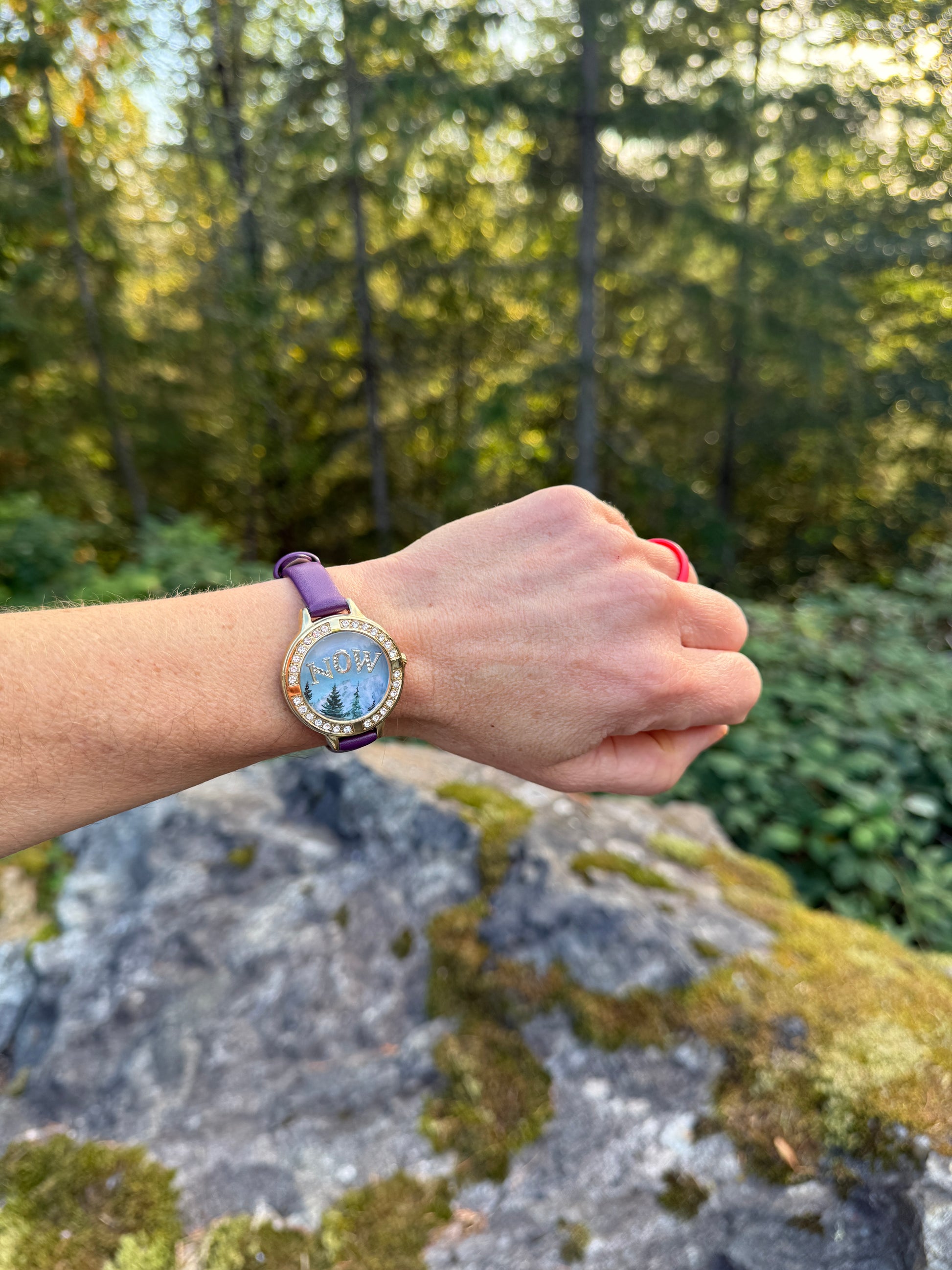 The gold pavé face glimmers like early morning sun cresting a ridge. Silver sparkly NOW letters rest above a delicate mountain and tree motif. A thin purple leather band wraps your wrist, fitting 5.75"–7.5".