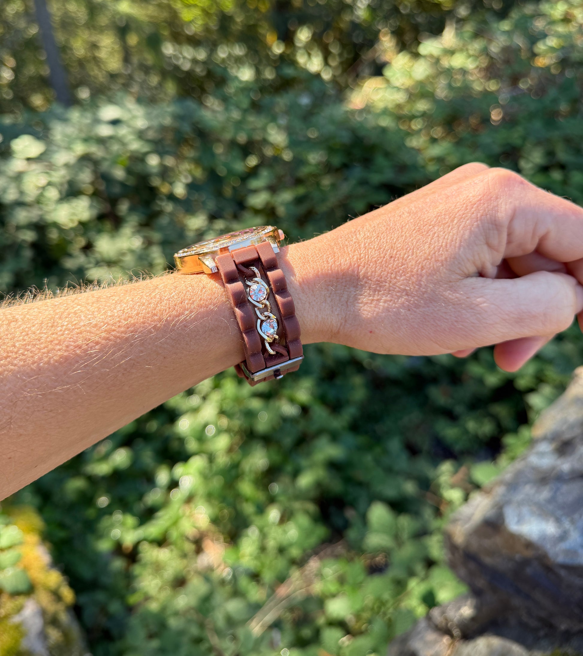 Band: Brown silicone with chain and gem detail