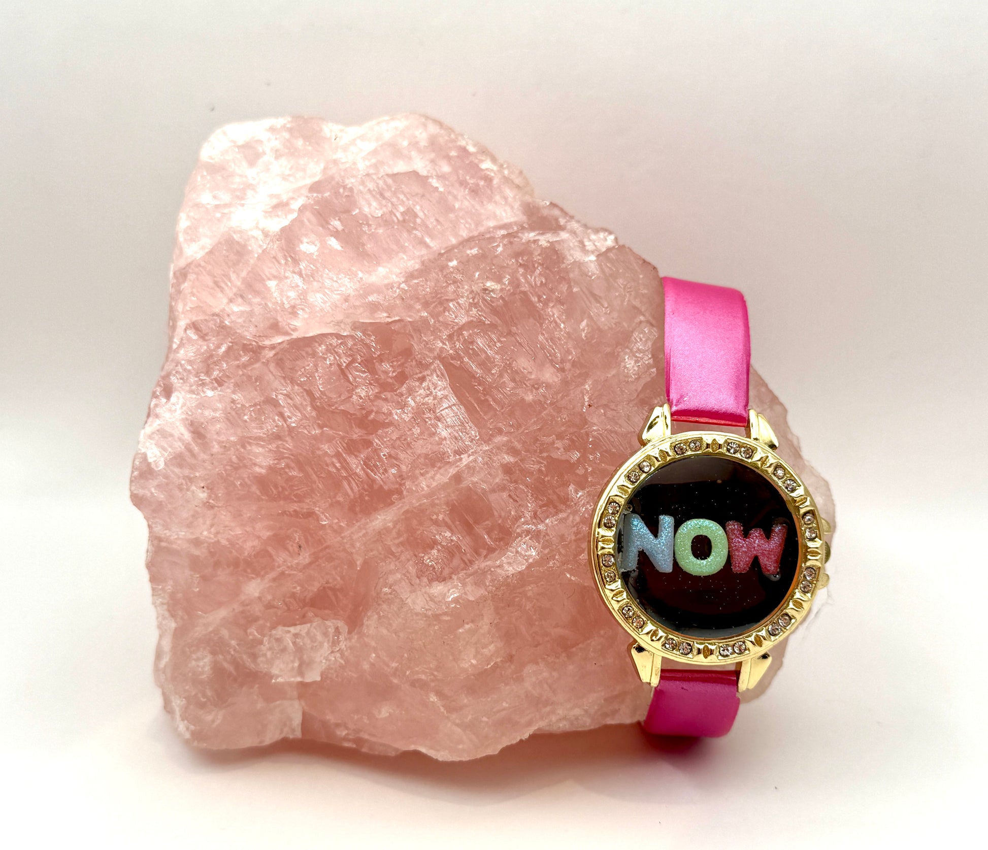 ELECTRIC NOW is a celebration of color! With a 1.25" gold pavé face rimmed in synthetic gems and a bright pink glitter wristband, it makes joy impossible to ignore. The letters ‘N-O-W’ flash in multicolored sparkle. Best fit for wrists 5.75–7".
