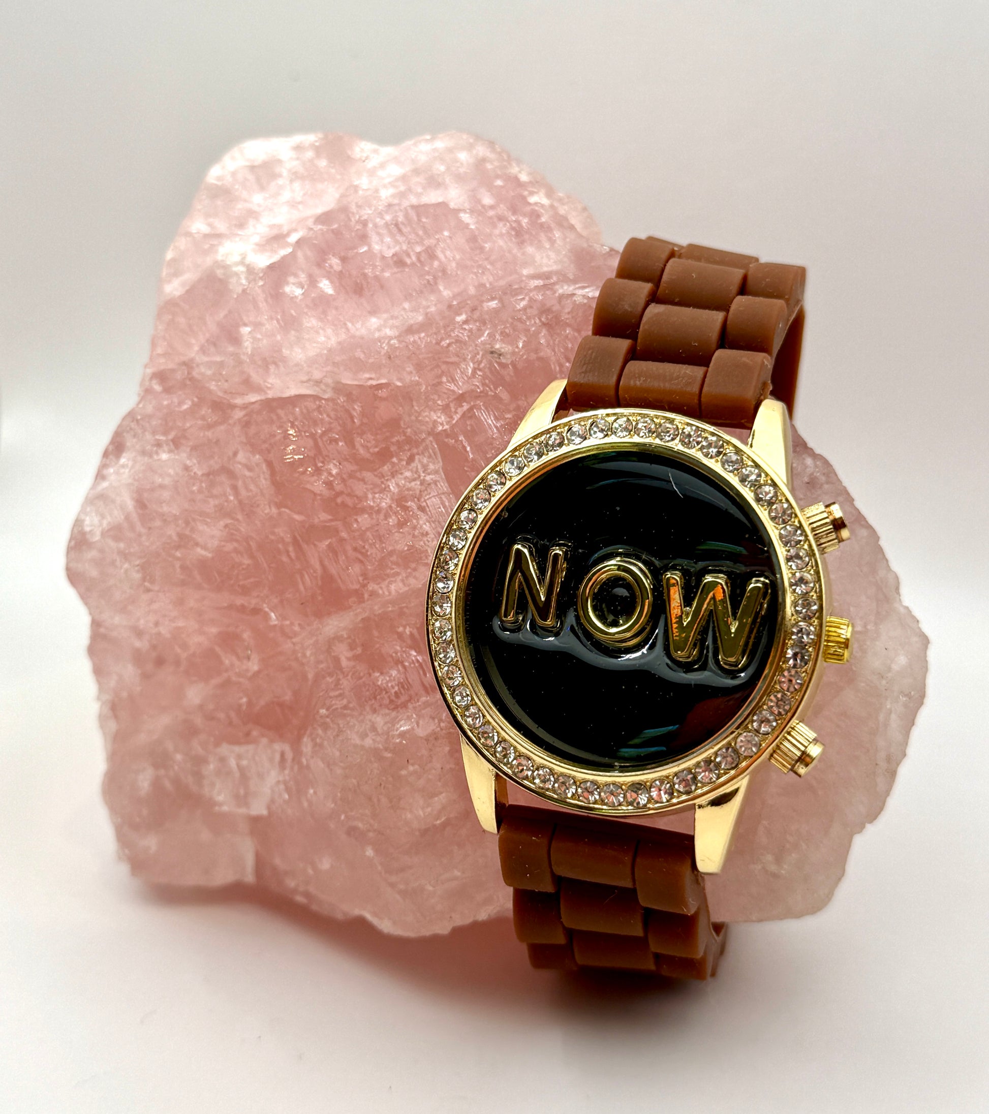 GOLDEN DAWN features a 1½-inch gold face encircled with pavé stones and gold “NOW” letters. Brown silicone band (fits 6.5–8.5”).