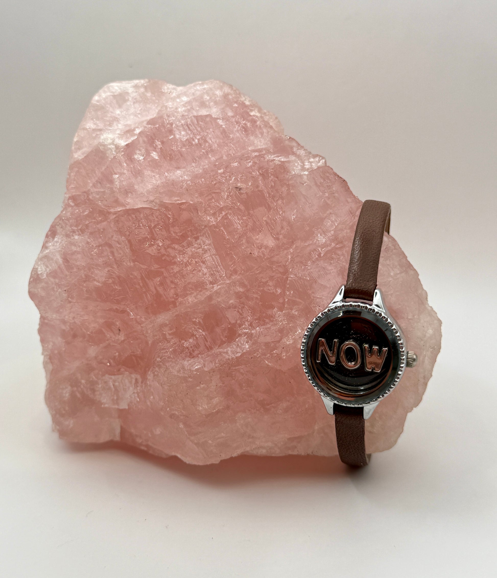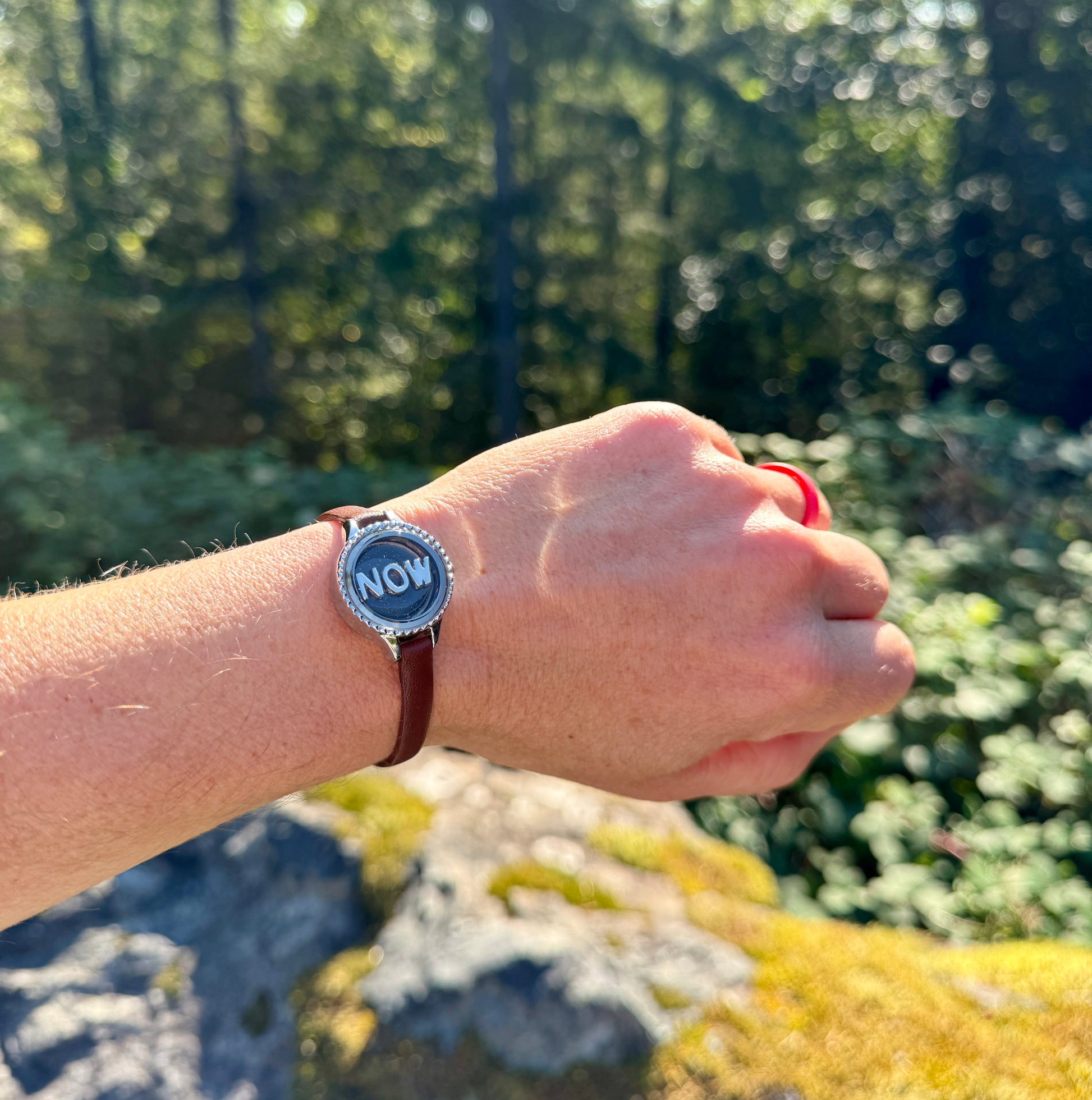 MOMENT OF STILLNESS features A ¾-inch silver face with silver “NOW” letters, paired with a slim brown leather band (fits 5–6.5”). A tiny little reminder of the presence that lives within you.