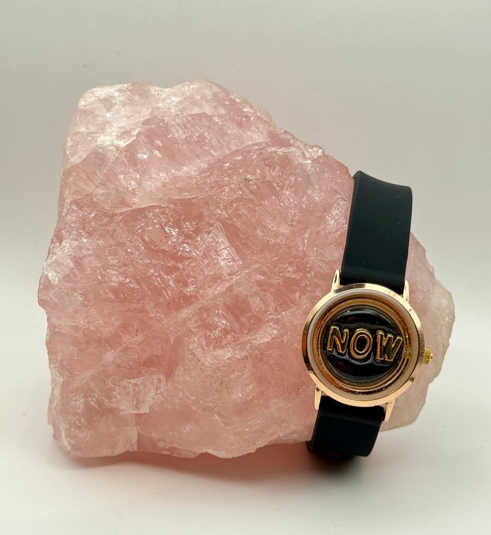 A one-inch rose gold face with gold letters whispering NOW, held by a sleek black silicone band. It’s the moment between inhale and exhale, light and dark, dream and waking. Fits wrists from 5"–7.25".
