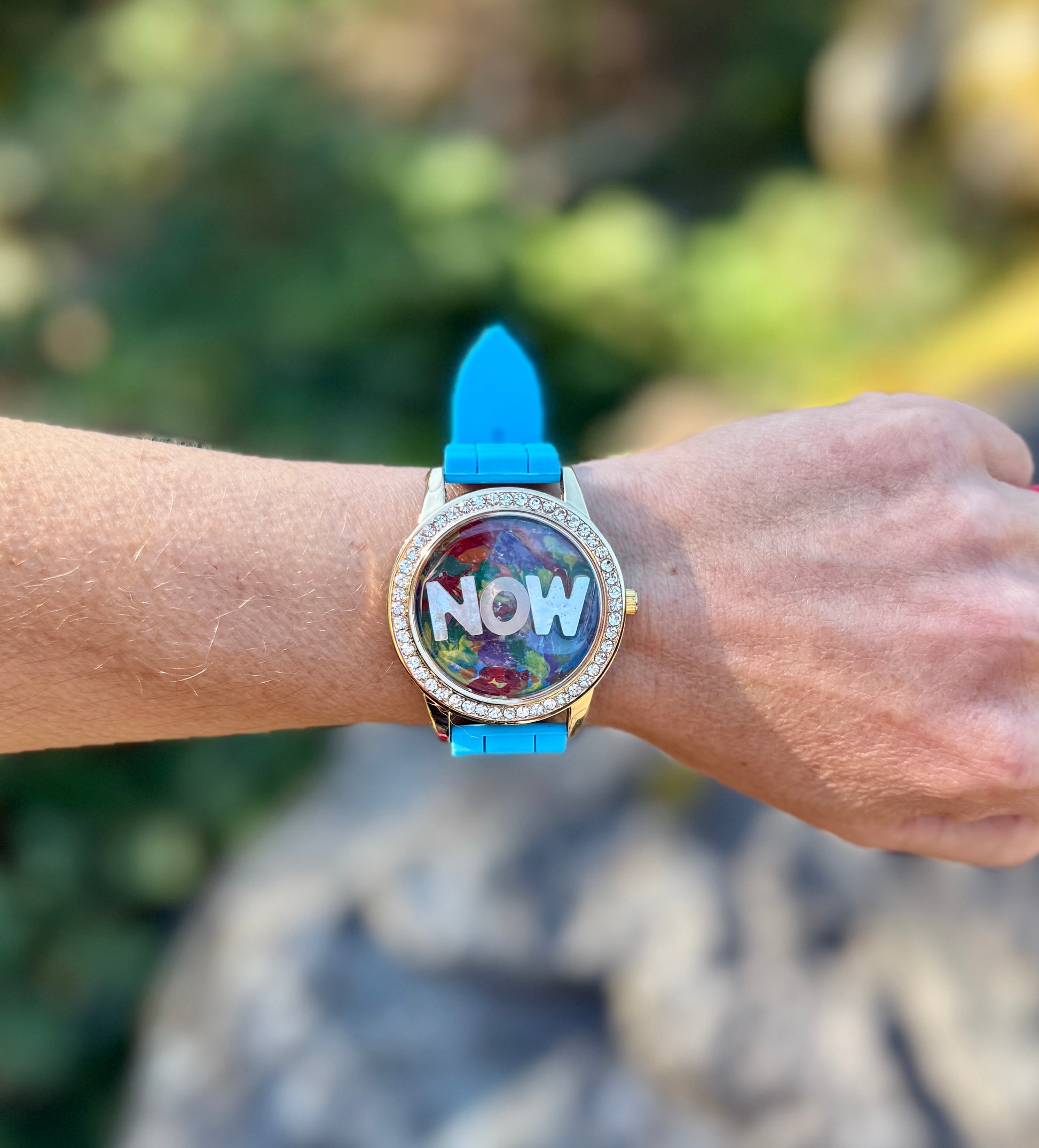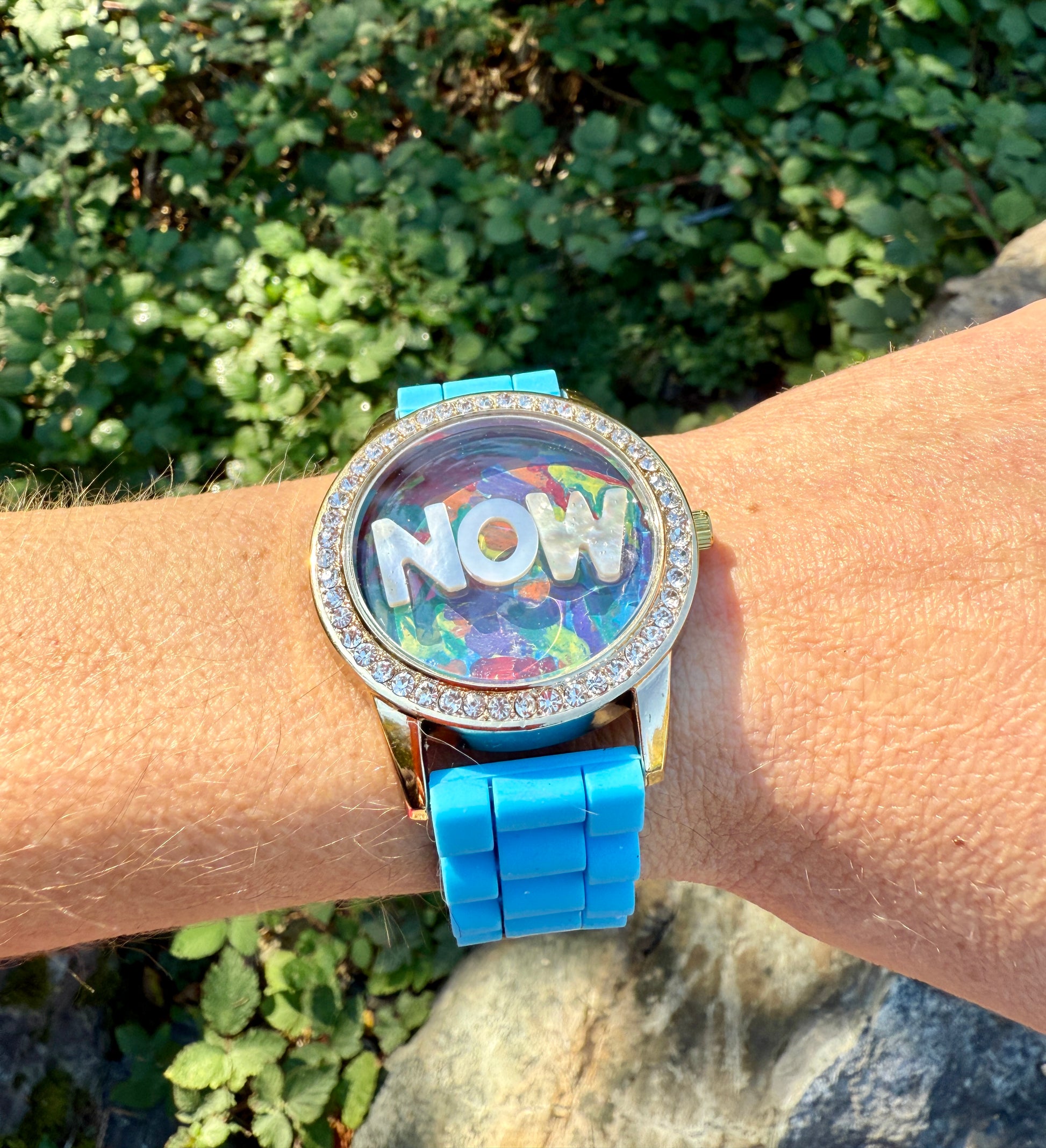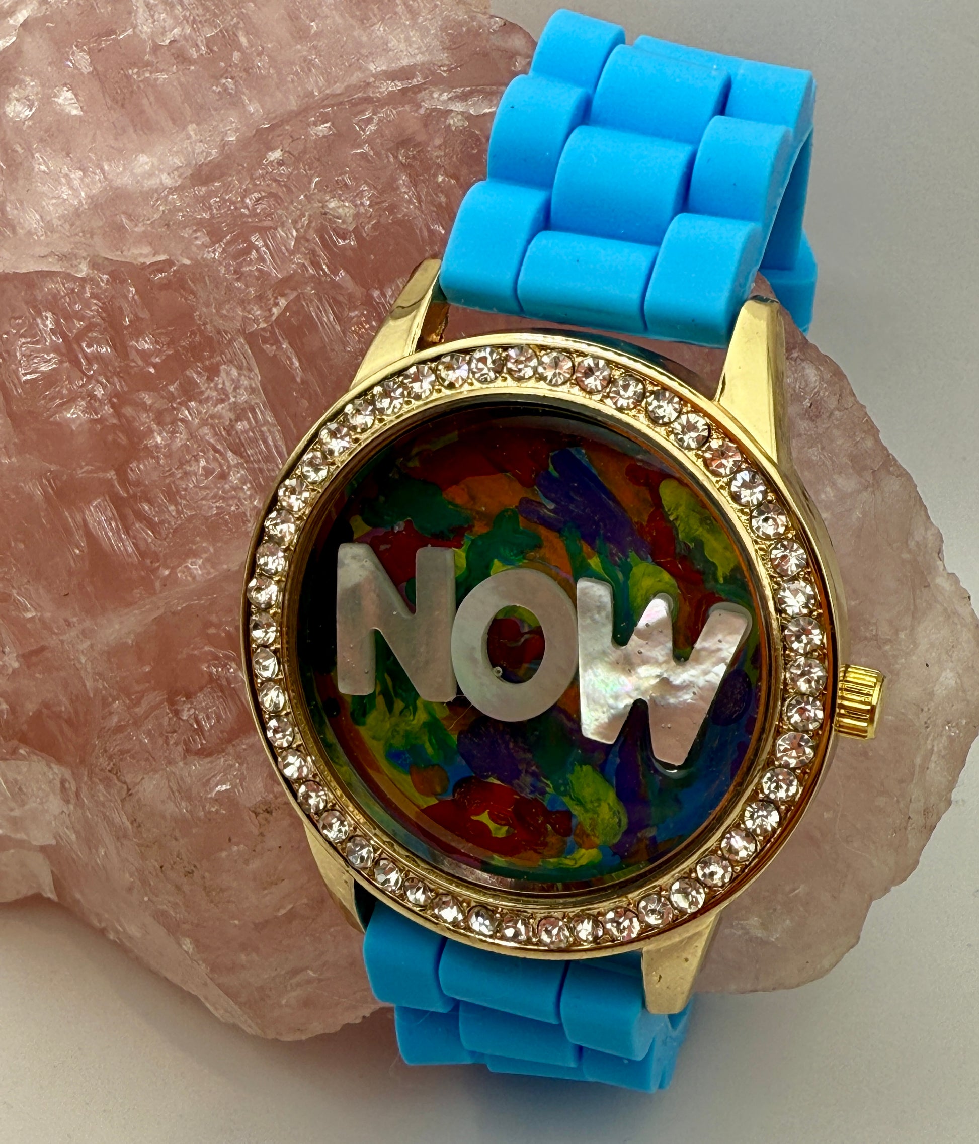 This watch features a one of a kind abstract painting (done by me!) in its interior, accompanied by mother of pearl letters that spell 'NOW'.