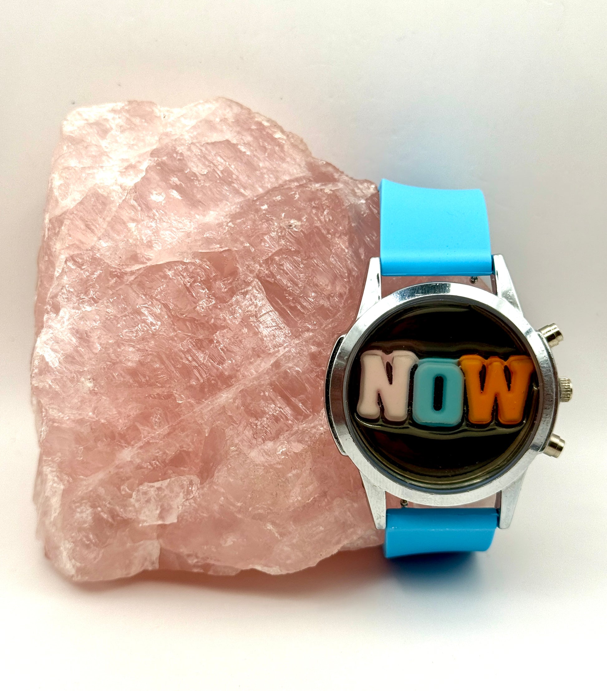 A silver face with rainbow letters spelling NOW, anchored by a bright baby-blue silicone band. Wide open like a summer sky, this watch feels like a cheerful presence on your wrist. Fits 5.75"–8.25"