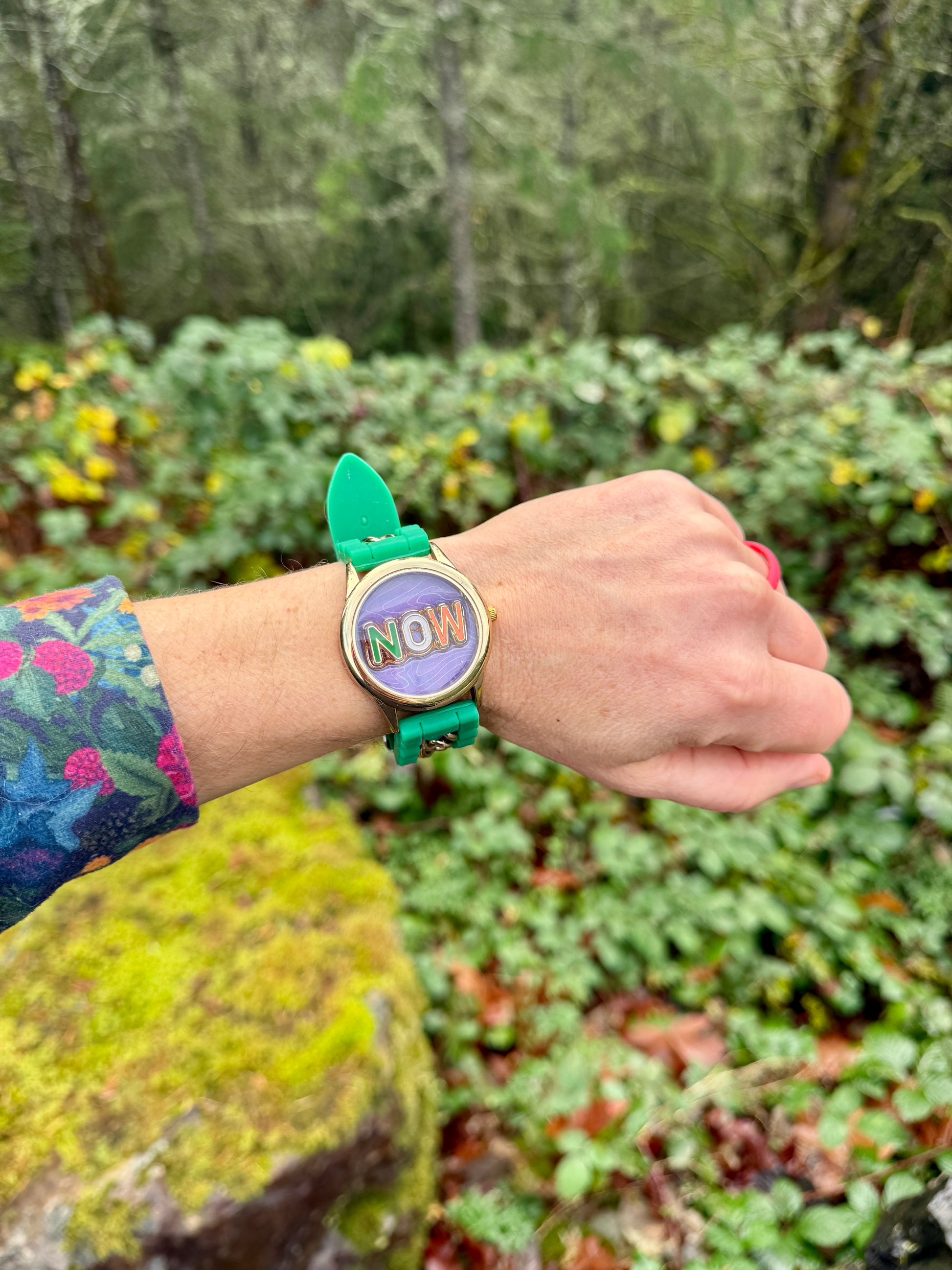 Every single NOW watch is handmade by me and my husband Aaron using upcycled watches that would have otherwise ended up in landfills. Each watch is completely unique and different and there are sometimes tiny air bubbles in the acrylic or slight imperfections on the glass or the surface of the watch.