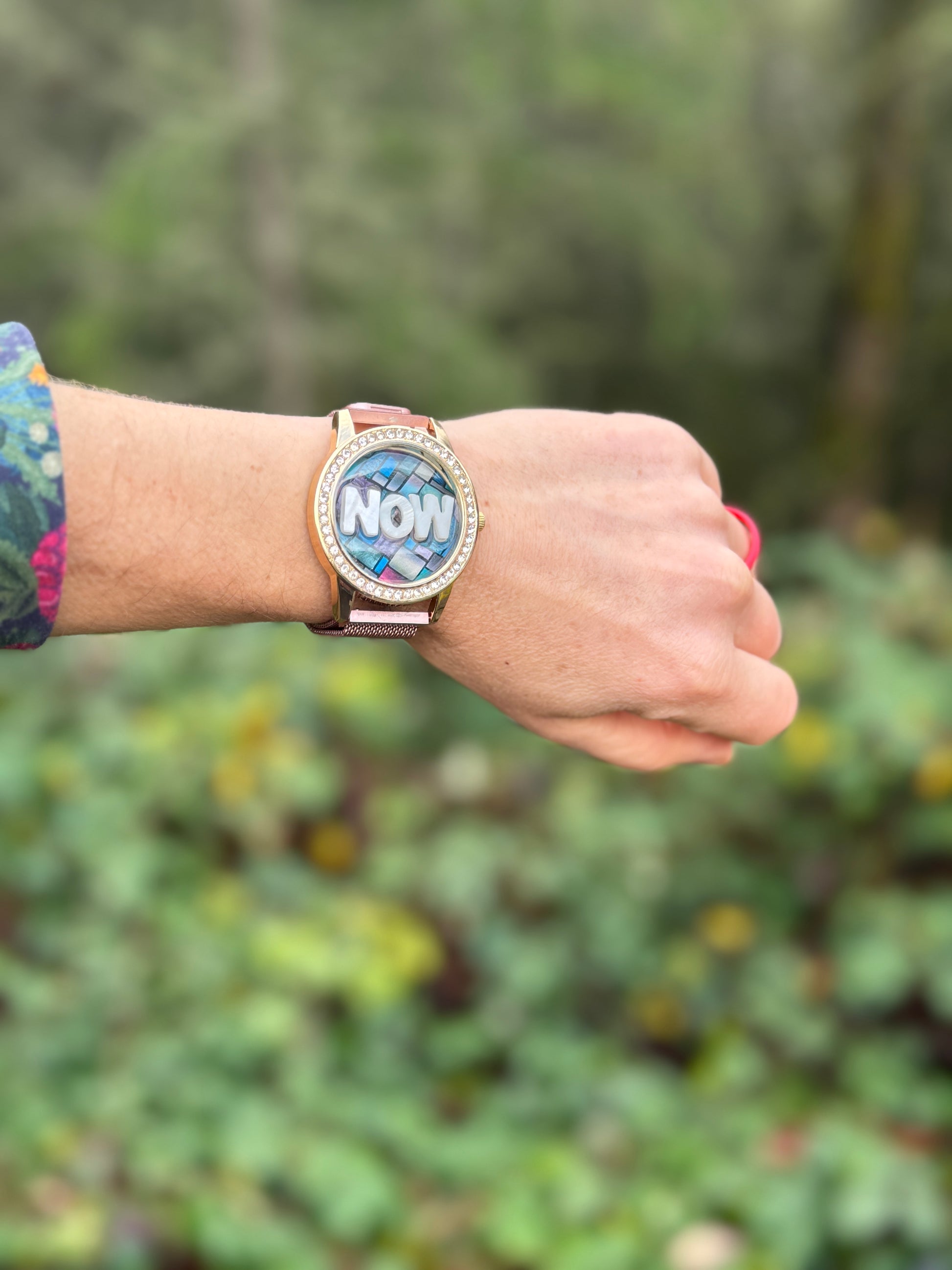 Every single NOW watch is handmade by me and my husband Aaron using upcycled watches that would have otherwise ended up in landfills. Each watch is completely unique and different and there are sometimes tiny air bubbles in the acrylic or slight imperfections on the glass or the surface of the watch.